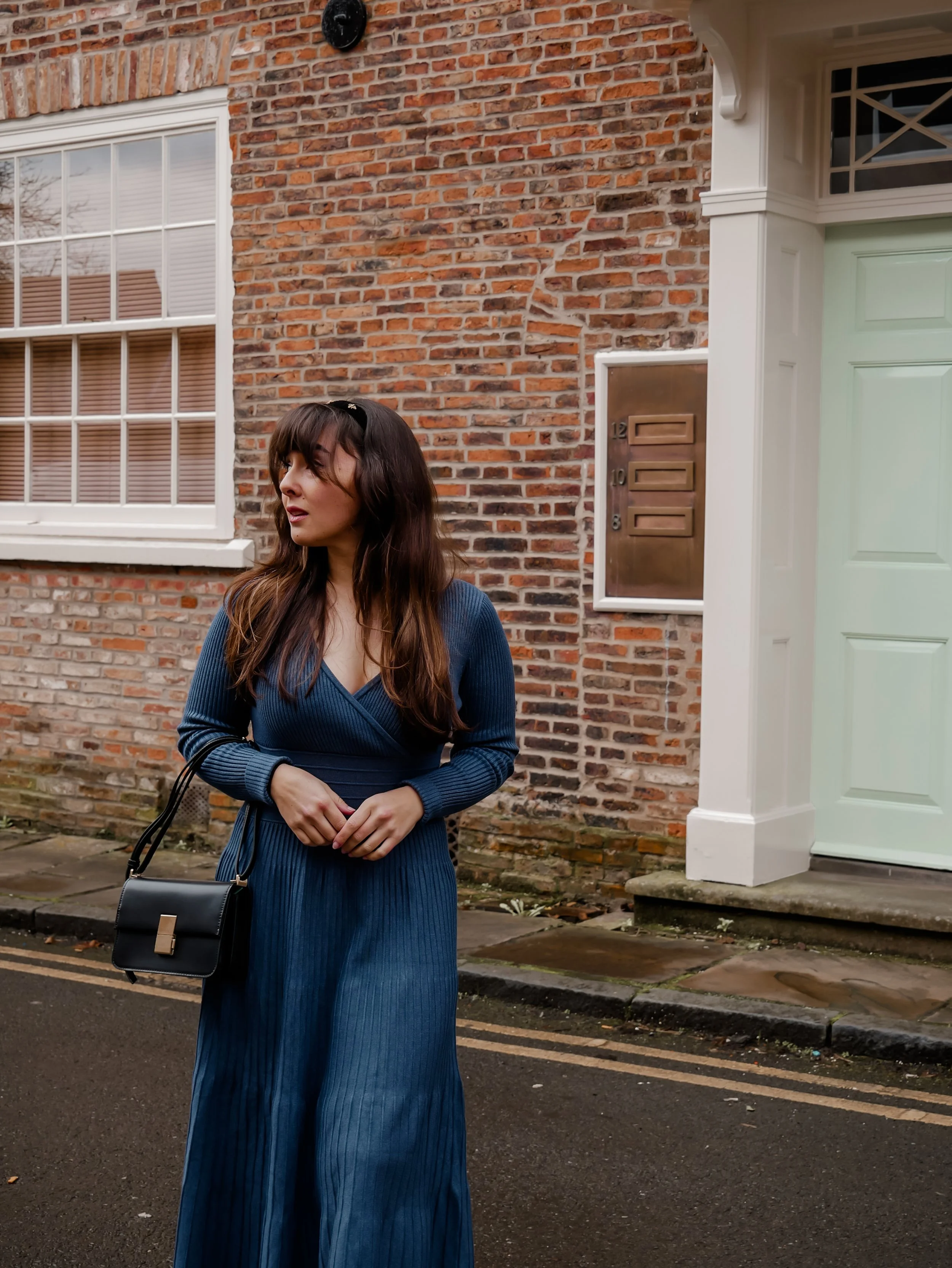 The focal point of my outfit was undoubtedly the stunning blue long-sleeved midi sweater dress. With its flattering V-neckline and midi length, it struck the perfect balance between casual sophistication and laid-back charm. The rich blue hue added a pop of color to the ensemble, perfectly complementing the cool tones of the season.