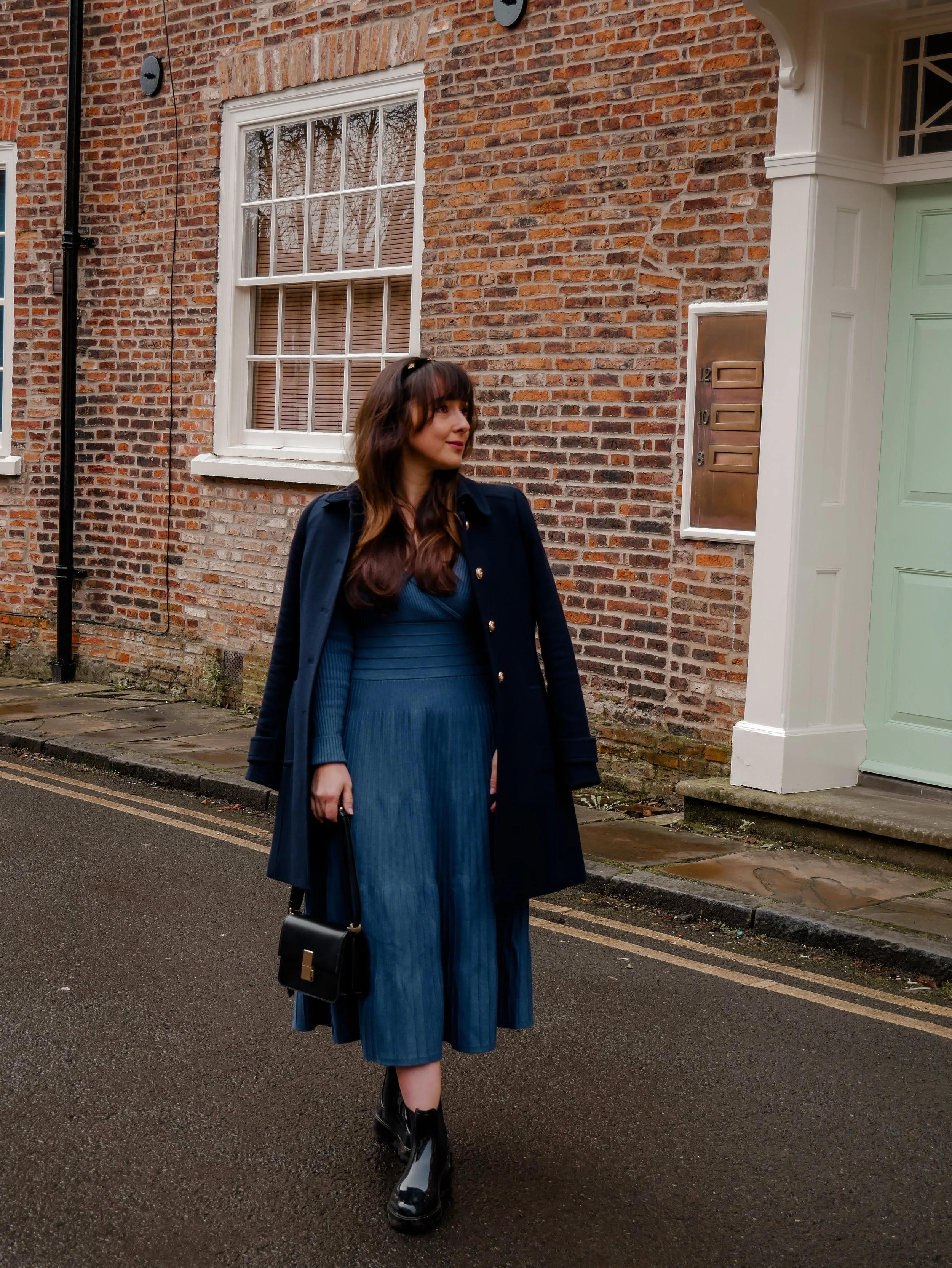 Layered atop my dress, a wool coat from J.Crew, adorned with classic old gold buttons that added a touch of vintage-inspired flair.